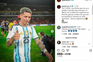 普雷斯蒂亚尼社媒晒出照片,庆祝完成阿根廷队首秀,配文:“2025年11月14日。这个日子将永远铭刻在我心中,我代表阿根廷国家队完成首秀。衷心感谢一路以来支持我的所有人,阿根廷加油!”